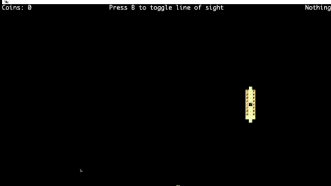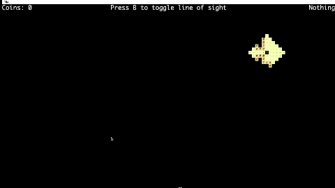 Line of Sight: Create a system so that the tile renderer only displays tiles on the screen that are within the line of sight of the avatar. The line of sight must be able to be toggled on and off with a keypress. Note the line of sight should NOT go through walls although it is fine to be able to wrap around walls/corners. Here are two examples of line of sight features that we will NOT accept: